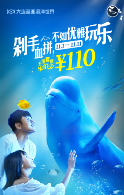以双十一为主题,海洋世界在此期间推出特惠票,迎合了双十一情侣一同出游的心理。“鲸彩圣亚,狂欢双11”的微信互动活动,主要突出双十一购票优惠的特点,让人体验一次说走就走的旅行。