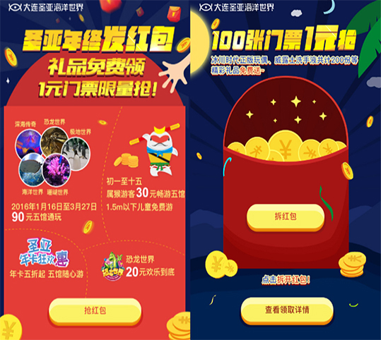 以春节抢红包为主题,圣亚借由春节之际推出年终发红包,礼品免费领,1元门票限量抢的活动,主要突出春节的喜庆氛围,结合时下流行的抢红包的活动形式,更容易吸引用户的目光,勾起用户探知惊喜优惠的欲望。
