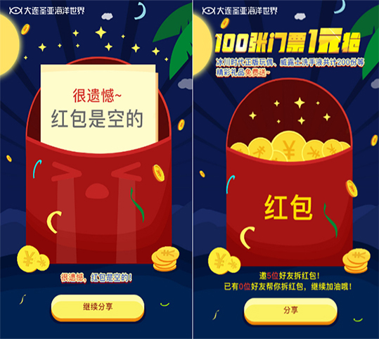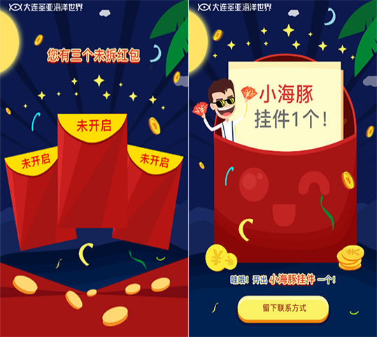 正值春节在即,根据品牌宣传需要,大连圣亚海洋世界为回馈一直支持与关注的朋友,以抢红包的互动方式给广大用户拜年并送福利,结合圣亚元素展示新年的氛围。活动的主要目的也是为了增加与用户互动,扩大用户对大连圣亚海洋世界的关注度,唤起用户对景区的关注和消费激情,以此引导促进销售。