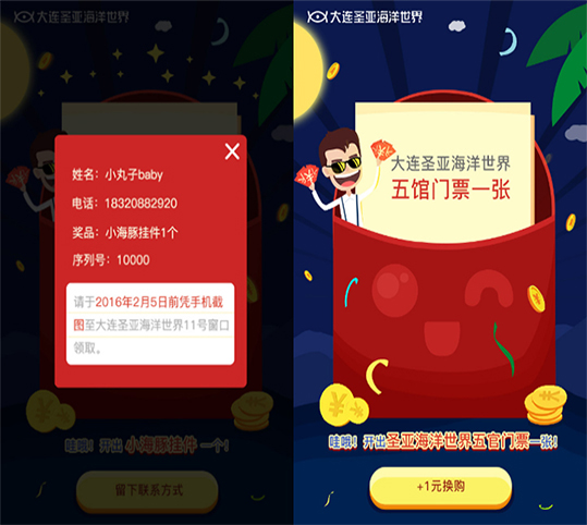 1.留下联系方式就能到大连圣亚海洋世界的景区去领取,这个方法能吸引部分用户对景区的好奇心从而促进消费。
