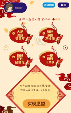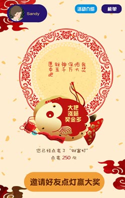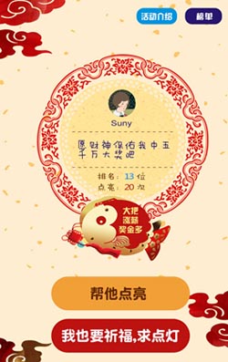 没有踩中幸运数字的用户可根据活动流程进入活动主界面,从十盏幸运鱼灯中选择一盏幸运鱼灯并写下自己的新年愿望提交并分享好友点赞总数排名前三即可获得额外的大奖。