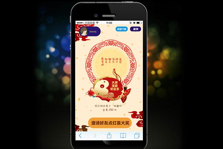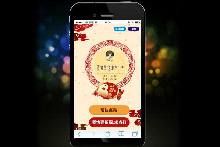 为方便活动结束后整理中奖名单以及后期的数据分析,活动有专门的管理后台,不同角色的用户访问的页面有不一样的互动界面;朋友圈用户点击朋友分享的活动链接,可以直接帮朋友点灯同时也可以自己参与活动,登陆参与游戏后,有一个自己的个人主页,可以随时进入个人页了解自己的活动情况,以及时去分享活动, 赢得奖品。