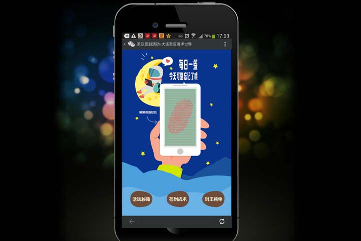 活动专题页面以简洁形象的方式呈现给用户,同时页面主题以指纹扫描的方式进行相关活动签到,参与形式上颇具新鲜感,这对主要的用户人群——大连本地学生更具有吸引力,通过形式的设置上在第一时间上提升用户的参与热情,更显人性化设计的重要性。