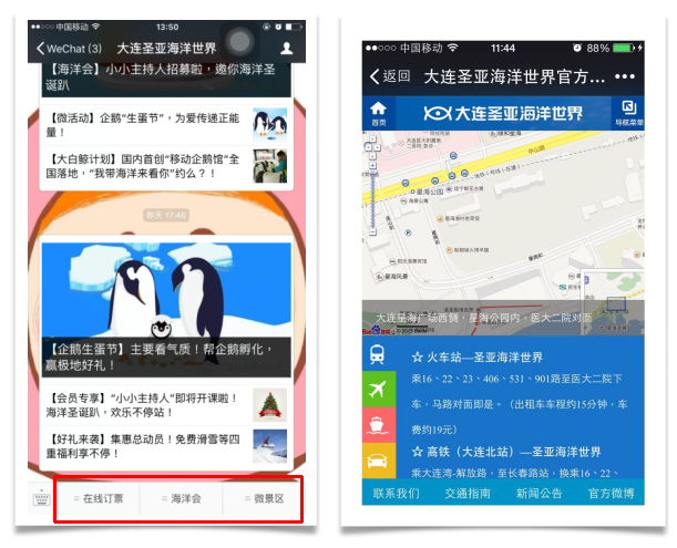大连圣亚海洋世界微信公众号根据功能的需要,规划了自定义菜单及2级栏目,并且植入了订票、微官网、景区导览等一键式功能!