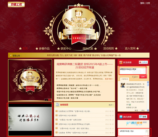"周黑鸭•首届名小吃大赛"专题minisite在整体策划设计上是颇有新意的,不仅体现了周黑鸭本身的品牌特点和形象,还结合了中华美食文化的特色元素,将此次美食大赛的精神——弘扬中华美食文化体现得淋漓尽致,同时各种营销互动元素、功能的实现,也为本次活动的广泛的传播奠定了基础。截至目前,活动已吸引参赛人数达1000人,访问量突破25,000PV。