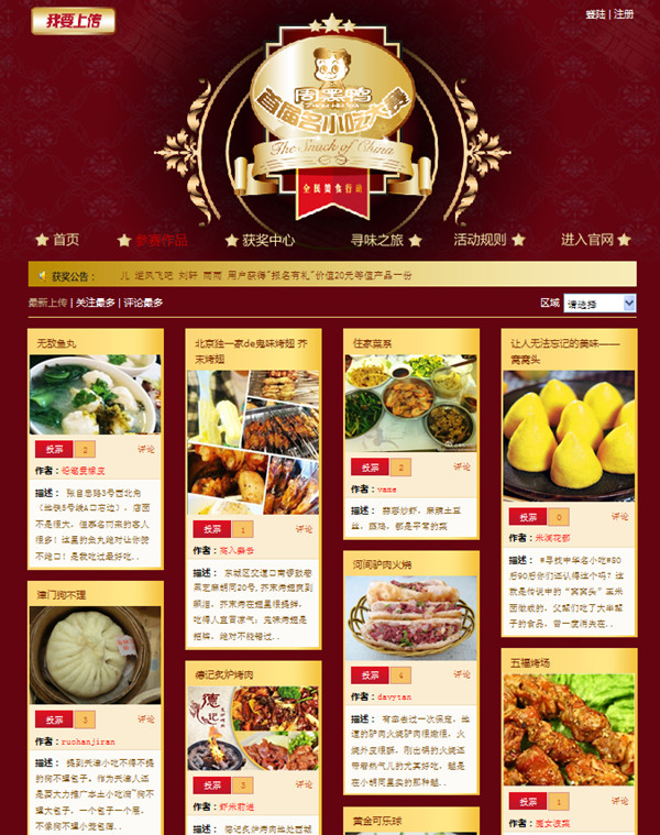 界面设计要求新颖独特,采用各种表现形式;结合中国传统文化元素,体现中华民族源远流长的文化美食韵味;功能上要求用户可通过在线注册、登录、报名,还可自行上传图片、在线投票、互动分享,方便营销推广传播。
