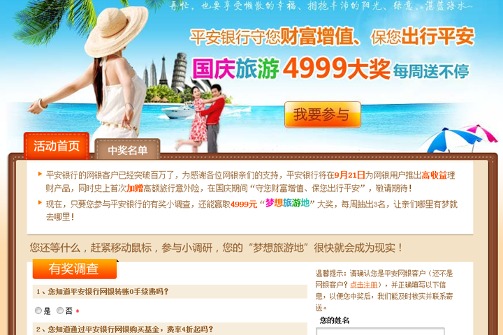 时值平安银行网银用户突破百万之际,平安银行借中秋国庆之机,推出国庆旅游4999大奖每周送不停活动,并希望能借节庆活动,对平行网上理财产品进一步推广,让更多受人了解并认可平安理财与其它产品 的差异化之处,并进一眯提高其市场知名度。