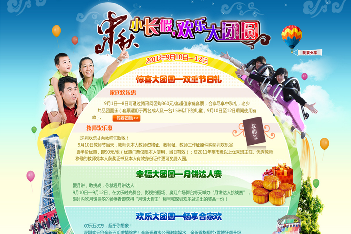 值中秋、教师节来临,从暑期结束后陷入短暂低迷的旅游主题公园又恢复了旅游旺季,旅游景区纷纷推出以中秋、教师节为中心的主题活动,唐宋中国做为欢乐谷的年度合作伙伴,及时为其制作了适合互联网上宣传的MINISITE旅游活动专题页面。并拟定了一系列营销推广计划。