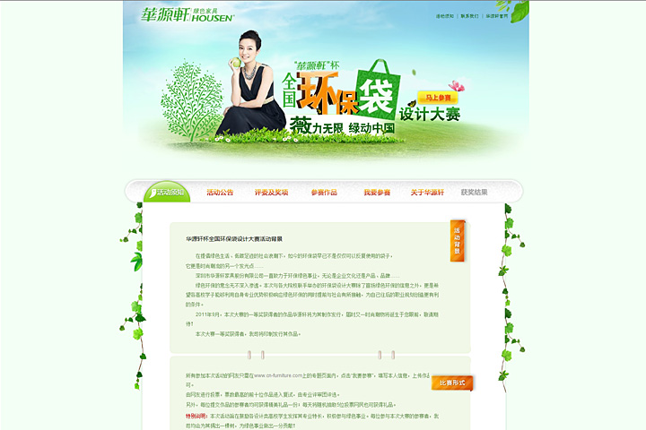 深圳市华源轩家具股份有限公司是国内绿色家居的领跑企业,在国内家居市场颇具知名度和影响力,2010年10月公司正式签约“赵薇”为绿色人居形象代言人。华源轩联手各大知名院校,设计类权威媒体,依托互联网和社会化媒体的强大魅力,以环保设计大赛为传播载体,打造了线下线上活动的绿色环保热潮。