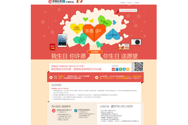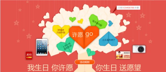 3、许愿树部分,五彩缤纷的心形点缀地恰到好处,整体色彩温馨和谐,丰富多彩的奖品配上潮流俏皮的文案,极富感染力,利于调动访客活动参与热情。微博、人人网、豆瓣等社区渠道的互通,满足了用户分享、传播的需求,更促进了活动信息的二次传播。