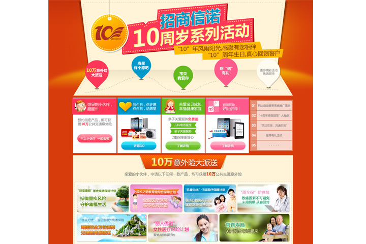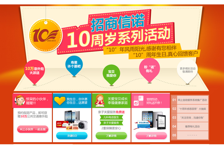 1、活动页面整体框架清晰简明,开头以一张打开的贺卡形式,突出十周年主典主题,各种活动贺礼以缤纷彩球形式呈现,无处不体现出喜庆、欢乐的节庆气氛,整个页面整简洁大气,富有趣味