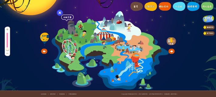 采用当下流行的扁平插画风格,可爱,亲和、童趣、阅读轻松,首页,用模拟地图的形式把所有的园区集中展示出来,可以通过鼠标滑动到不同的区域显示该版块的特色和介绍,点击可进入该区域页面;