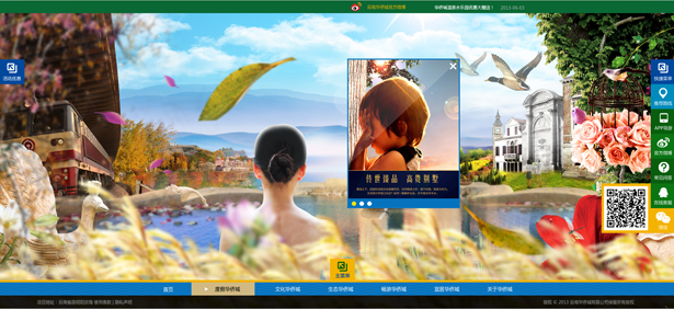 网页中,以飘窗和嵌入广告栏两者结合,飘窗设计动感十足,广告栏的设计中木质的框架浑然天成,丝毫不觉突兀,两者相得益彰,能够及时更新官网信息和景区动态