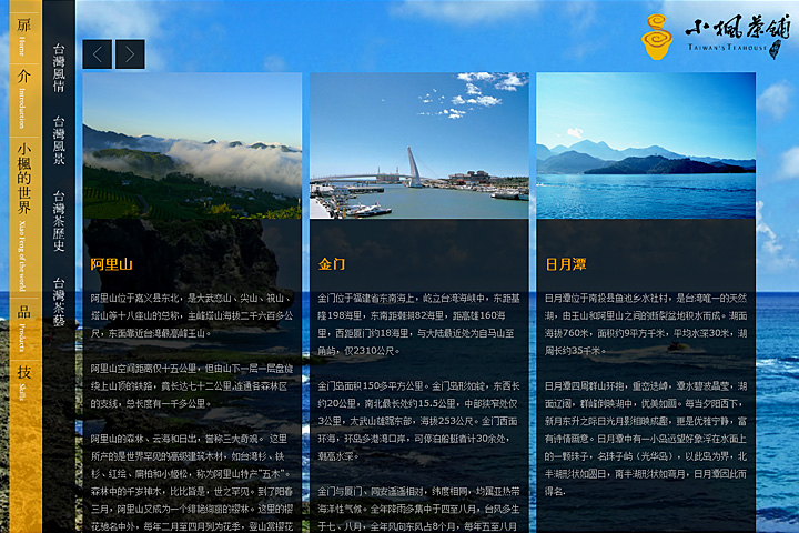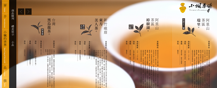 缓慢流动的FLASH画面,好似细细品鉴的茶韵,顺着脉路展开,缓缓走近茶的文化,台湾的文化,走近小枫的世界,了解品技的用心。整个网站一气呵成对产品的展示淡雅清秀,使浏览者自然而然的记住产品品牌