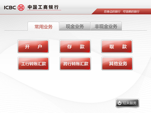 上图即为工行营业厅触摸多媒体系统UI界面,目前,用户能通过该系统实现个人和对公两种业务的办理。