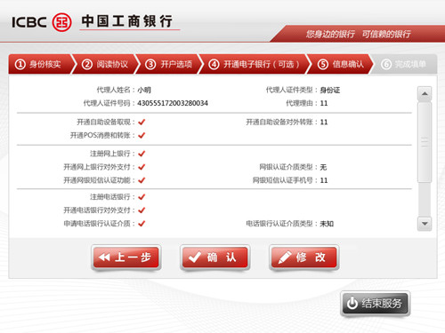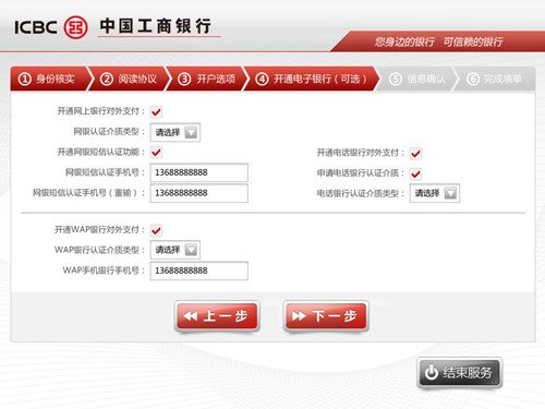 如果在上图中用户选择的是开户业务,那么在接下来出现的页面即如上图所示,用户可选择是否开通网上银行、网银短信认证功能、电话银行对外支持等功能进行相应操作,非常便捷。
