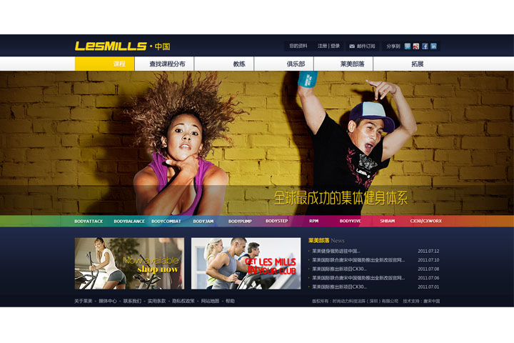 新建的莱美中国官方网站整体风格动感十足,激情四射,视觉感染力强;我们在创意设计过程中力求融入炫彩、时尚等多种元素,以突出健康、富有活力的主题;采用富有张力的人物元素为设计背景,传递健康时尚气息;色彩丰富的快捷菜单(即莱美健身课程目录),体现了莱美项目的多元化,也是了解内容详情的快速通道。