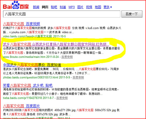 自建设一个月后,经过唐宋中国的优化推广,在百度GOOGLE搜索关键字“武乡八路军文化园”,自然排名第一页第一位