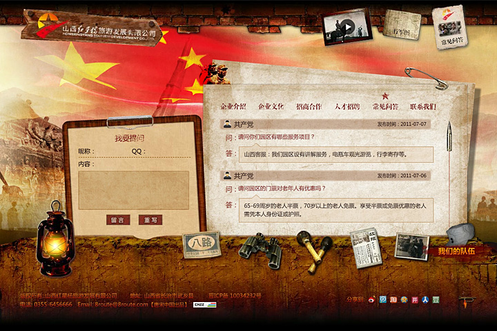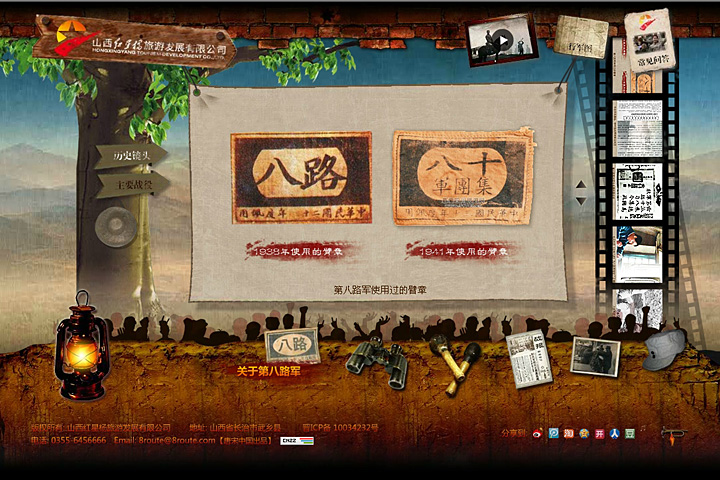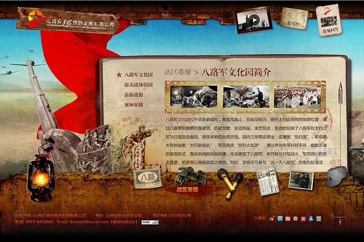 登录山西红星杨红色旅游主题公园网站,在煤油灯一闪一闪的辉光中,翻开了那段红色的历史,一段由唐宋中国团队精心编排的创意视频便将网友带进了那个战火枭烟的年代。 散落在页面中的那个年代的各个元素,臂章、手榴弹、战报、军帽等等巧妙的被设置成了各栏目的导航,很好的引起消费者的视觉联想。